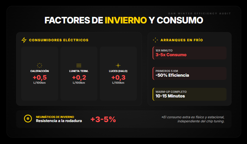 - Calefacción: +0,3-0,5 L/100km