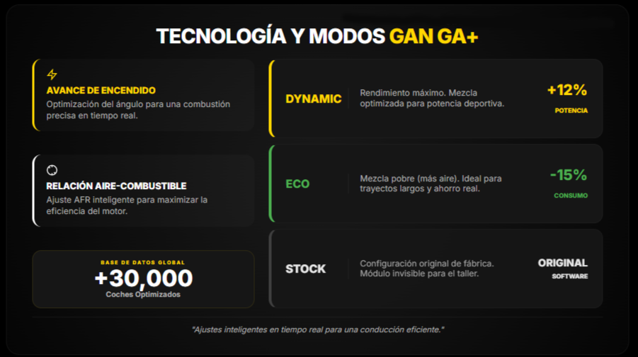 La clave está en módulos profesionales con múltiples modos adaptativos. Sistemas genéricos sin modo Eco no ofrecen esta flexibilidad. GAN proporciona control total vía smartphone: Sport para adelantamientos, Eco para autopista, Dynamic para uso diario.