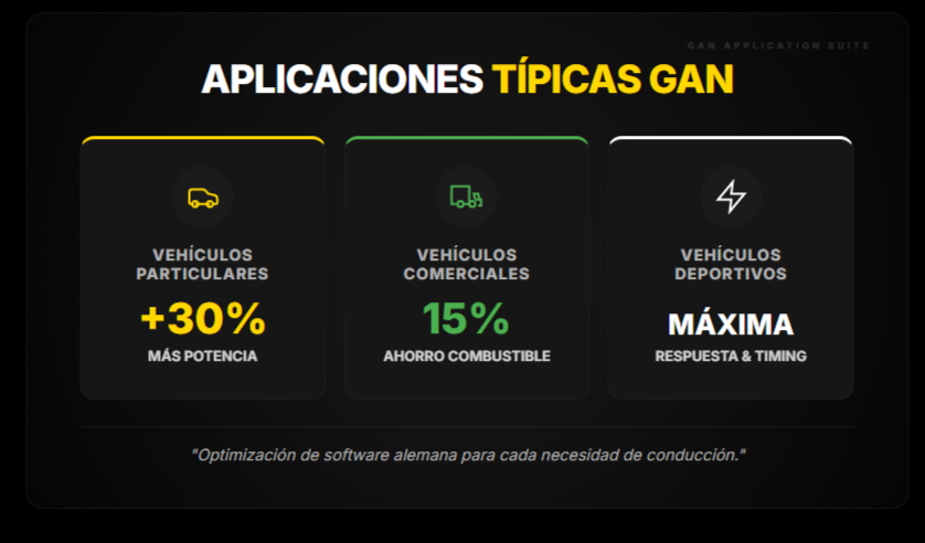 - Módulo GAN: aumentos hasta +30%, garantía motor €5.000, 50 días prueba, reversible 1 minuto