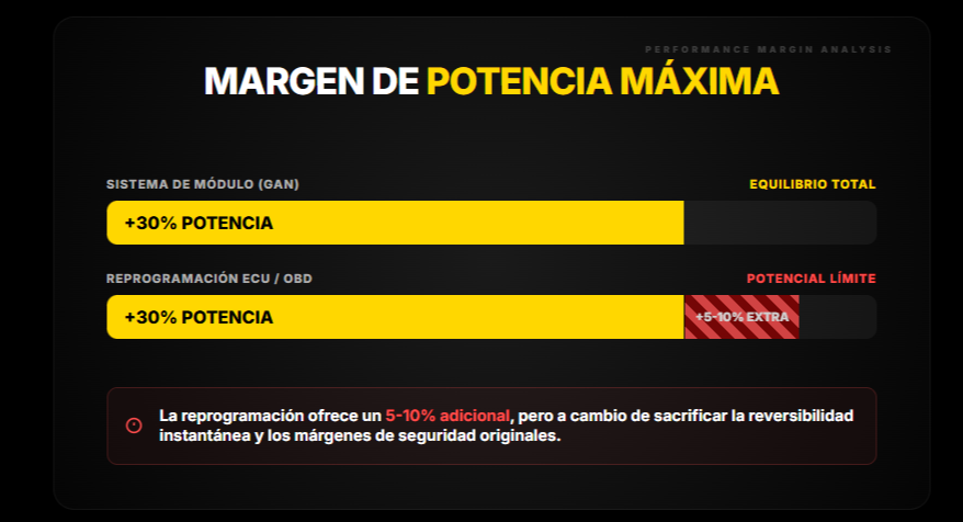 Respuesta: Según el equipo GAN con más de 20 años de experiencia, la diferencia absoluta entre método OBD bien hecho y módulo profesional es típicamente 5-10% adicional en casos extremos. El OBD accede a mapas que módulos no modifican, pero estos mapas adicionales aportan beneficio marginal en uso diario. Lo que especialistas OBD no mencionan son riesgos inherentes al método.