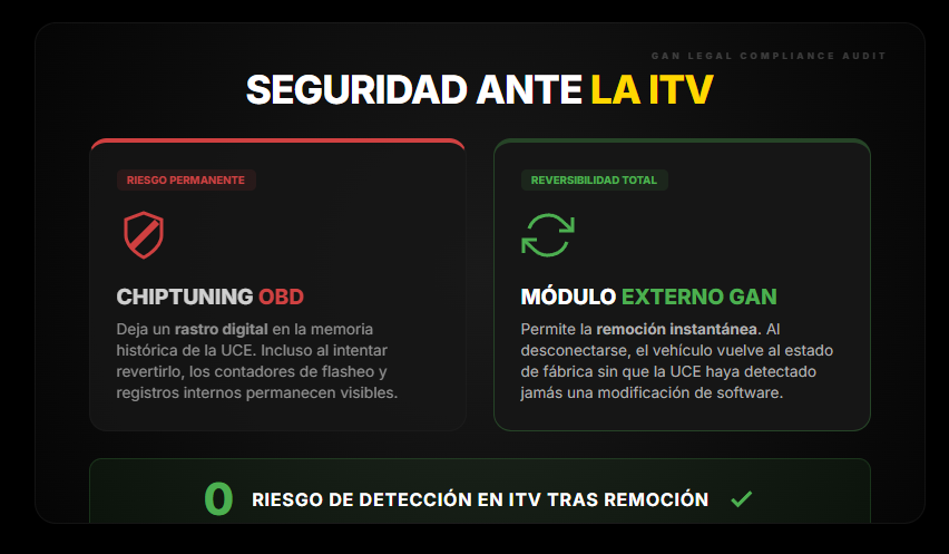 ITV no detecta chiptuning software internamente, pero módulo externo permite remoción instantánea eliminando todo riesgo. OBD permanece en UCE incluso si intentas reverter.
